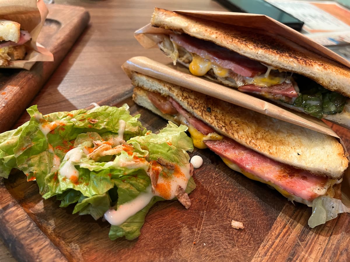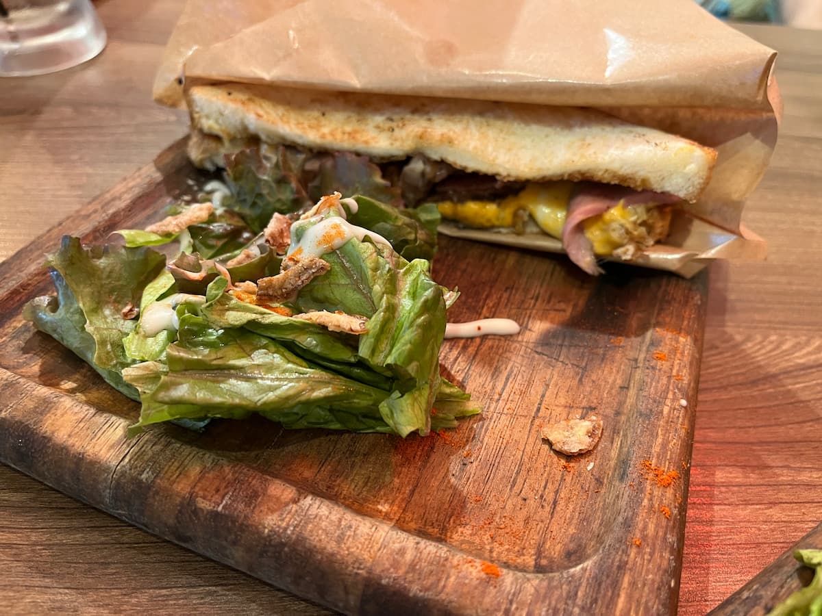 私達だけ、ガッツリ、サンドイッチを。モッツァレラとチェダーの2種類のチーズをたっぷり入れているそうです。ホットサンドって美味しいよね~